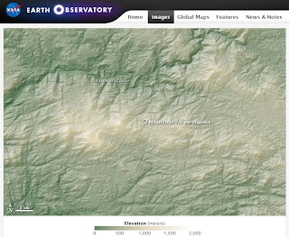 濃い緑が低く、ベージュが高く、その高低差は1100mと急峻。べー序の帯が西北西であることから、ここに西北西走行(=向き)の断層がある、とUSGS(アメリカ地質調査所)の見解。