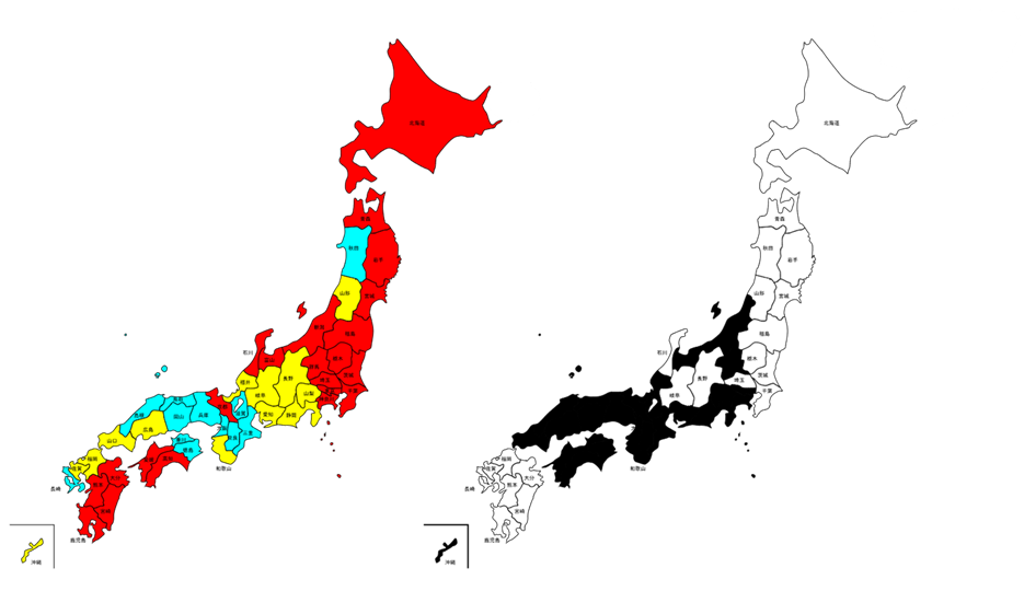 図3:左図:2025年の1年予測(赤・青・黄は図1と同じ意味),右図:2025年の1年間で震度4以上の地震を記録した都道府県(白)と地震が起こらなかった都道府県(黒)